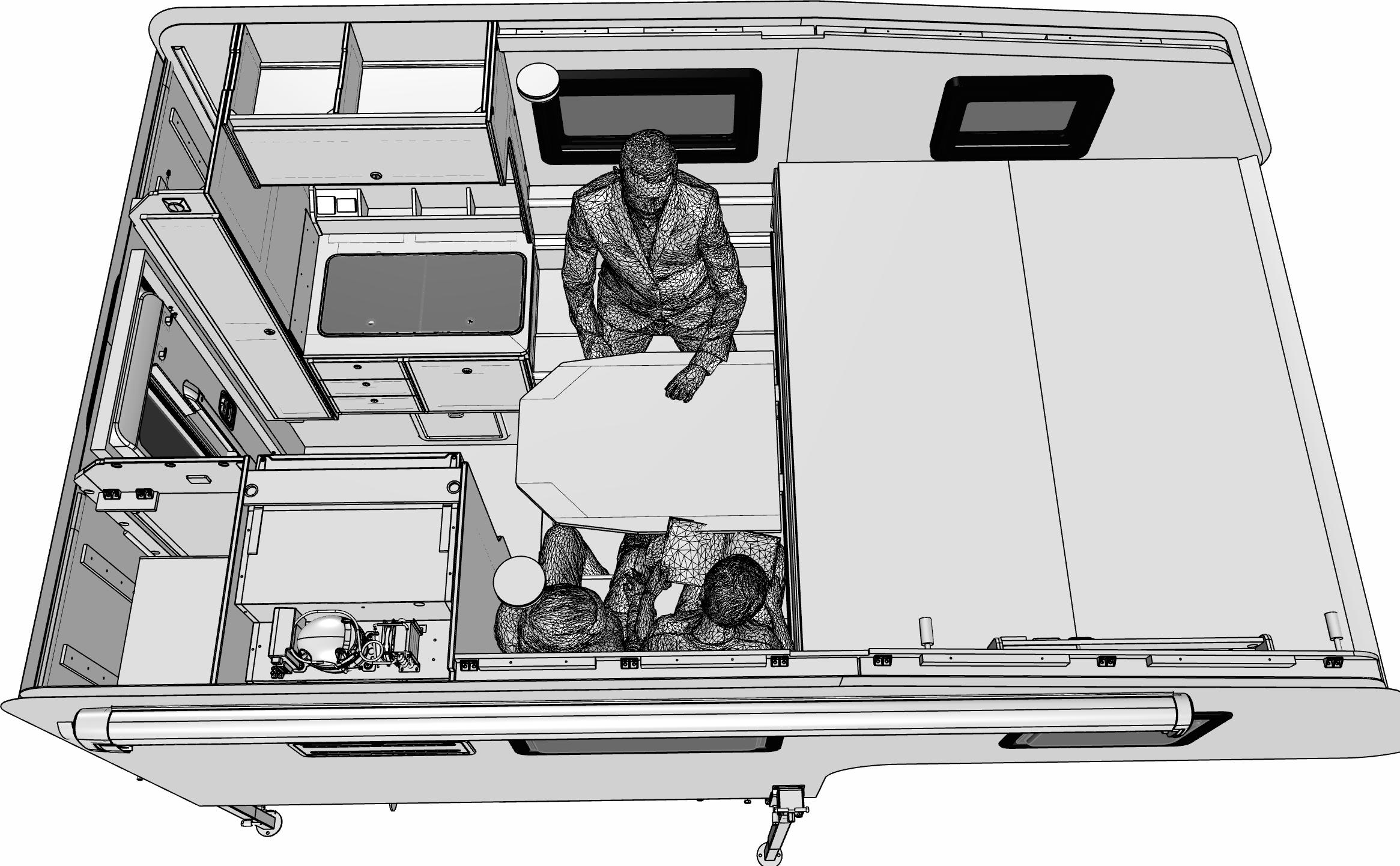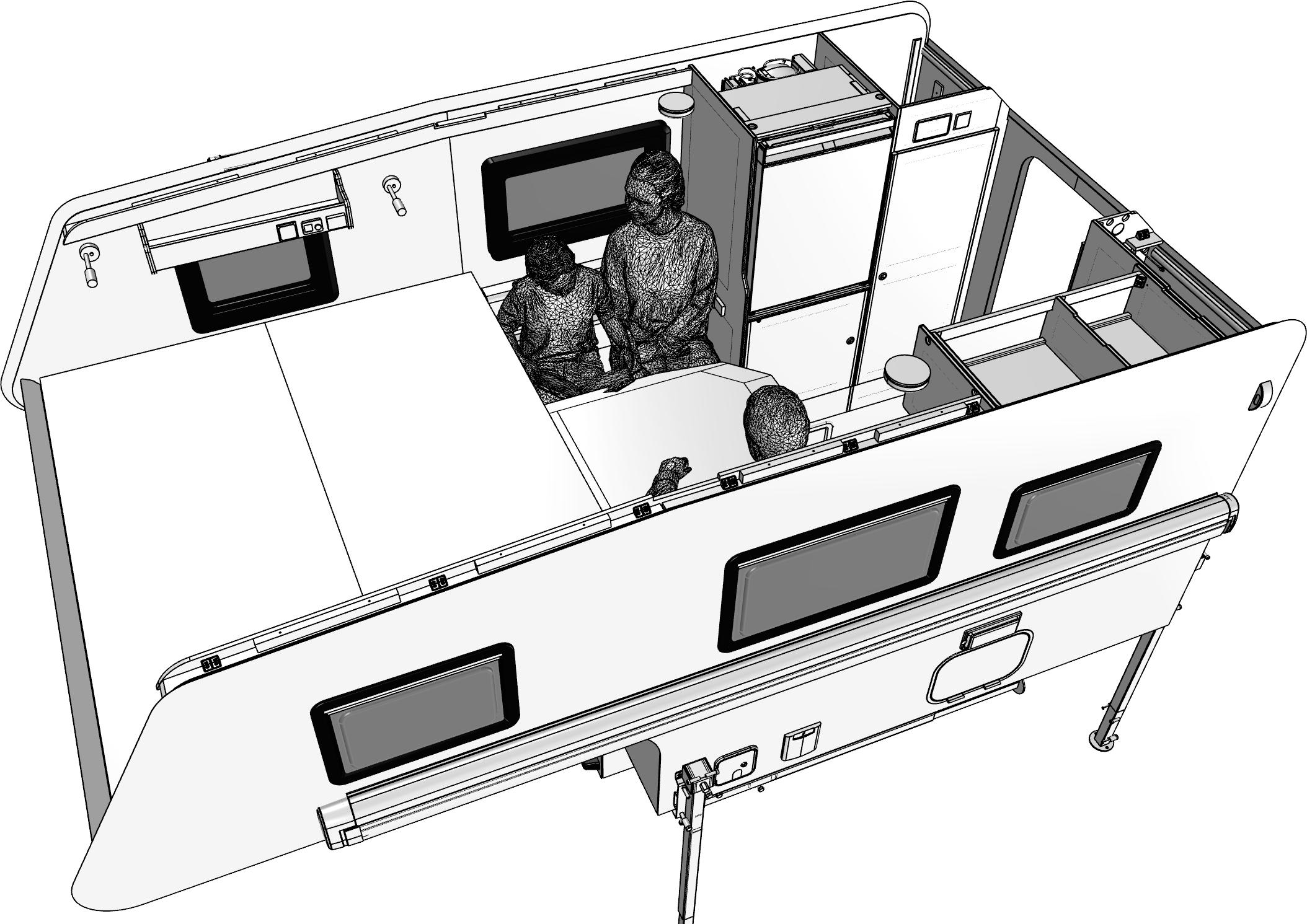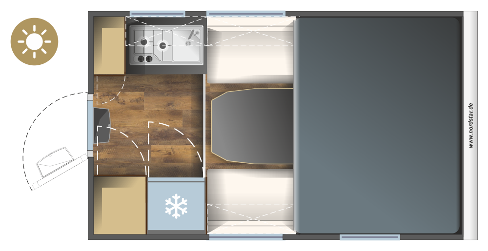 Nach unten verlagerter Schwerpunkt für bessere Fahrstabilität. Großzügigeres Raumgefühl da Ihr nicht unter drückenden Hängeschränken sitzt sondern den offenen luftigen Alkoven genießt. Das Staufach für ein portables WC ist nun auf Bodenniveau untergebracht. Hier drin finden ein Porta Potti oder eine moderne Trockentrenntoilette gut erreichbar ihren Platz. In diesem Zuge konnten wir auch die Fensterfläche vergrößern, für einen noch besseren Ausblick und mehr Tageslicht in der Kabine.
